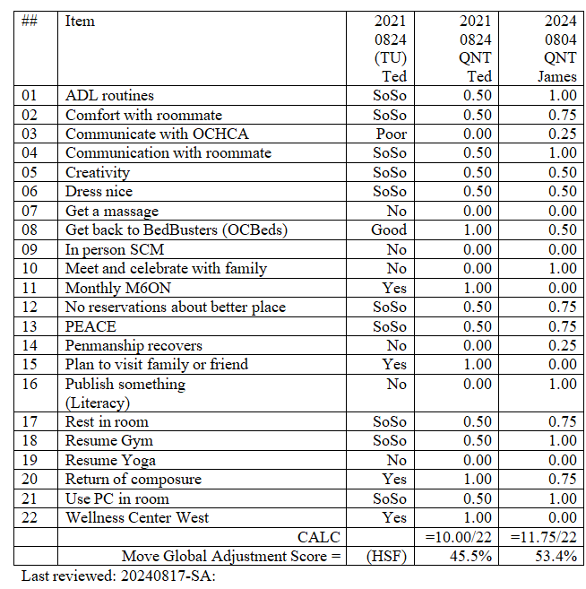 This is a Mini Structured Temporal Reconciliation (STR). STRs are similar to charting. We use STRs to cope. Make note the notation that our health is failing. We wished the belligerent Ted would be placed in another bed. Of course, we would want a GoodBed for him. In January 2024 we had Ted call 911 for us. We ended up at Aliso Ridge Behavioral Health. The ongoing problem was: We were released to the same BadBed sharing a room with Ted. Ted chronically interfered with our sleep.